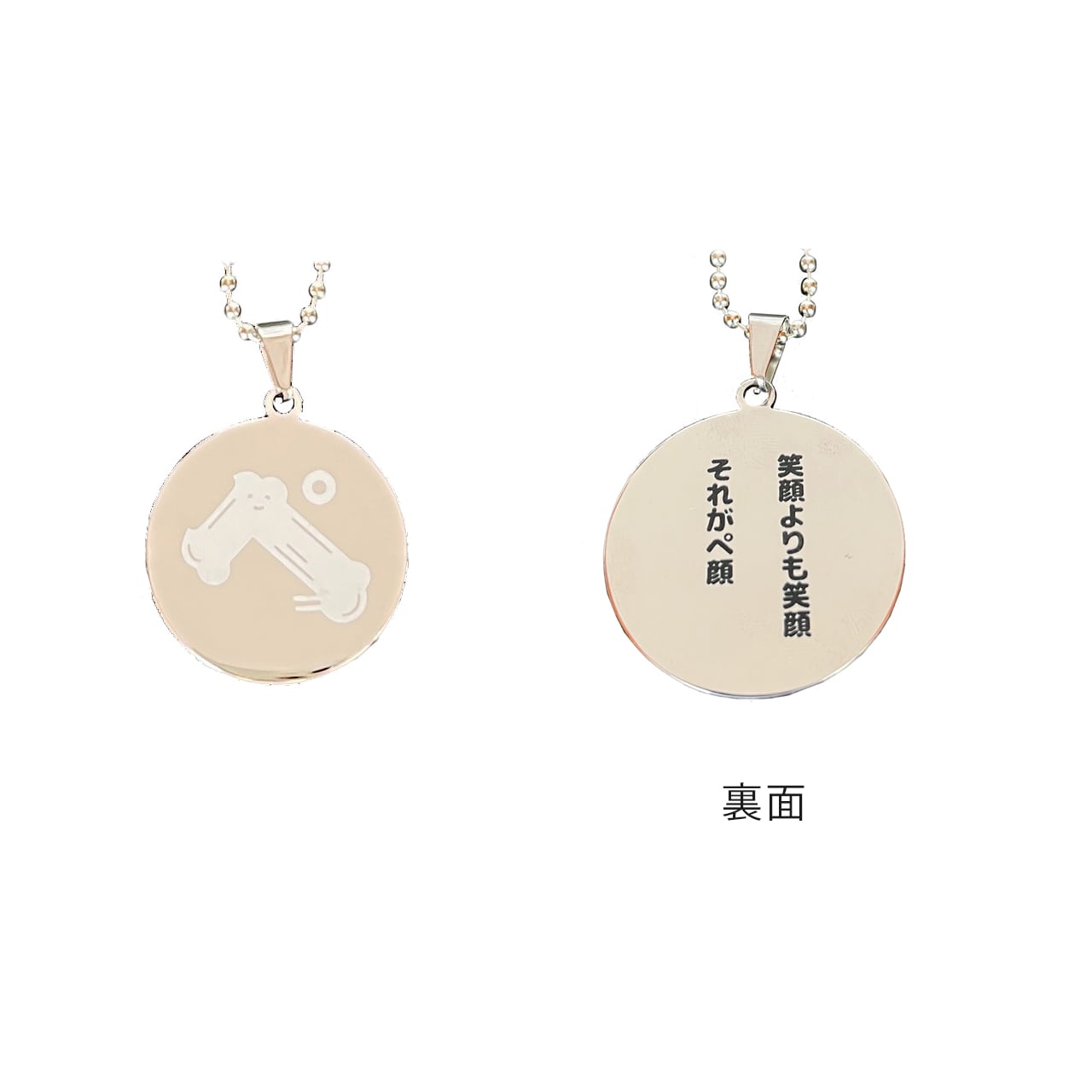 石田意志雄展2025公式グッズのペンダントです。表面には説明がしづらいキャラクターの「ぺ」がホワイトインクでプリントされており、裏面には謎の名言「笑顔よりも笑顔 それがぺ顔」が黒インクでプリントされています。サイズ感は2枚目の画像を参照ください。これ、意外とイケてますので、ぜひ。