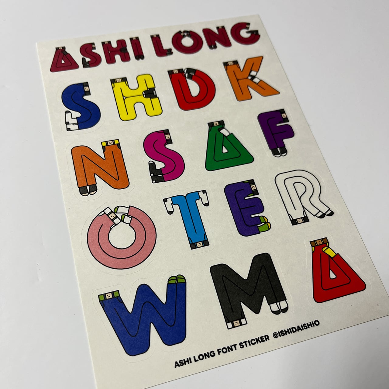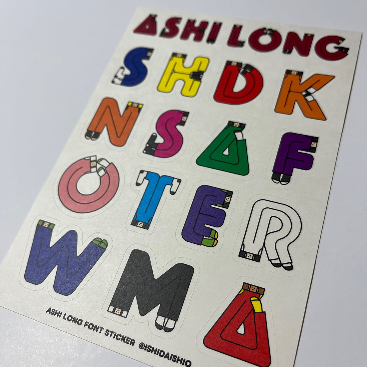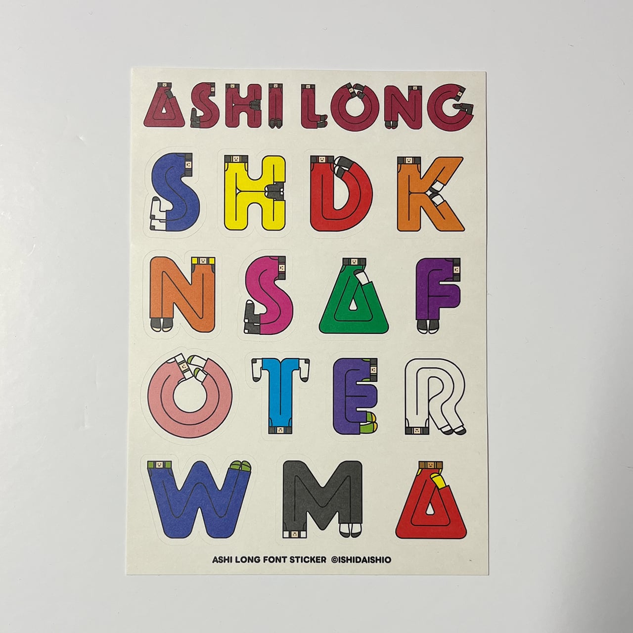 A6サイズの上質紙シールの中に、ASHI LONG FONTを15点詰め込みました。アルファベットと色は適当に選んでいます。1行目のASHI LONGの文字はカットラインがありませんが、15点のアルファベットはカットラインがあります。上質紙のため、光沢はなくマットな感じです。「O」と「W」はなぜそのカラーリングにしたか忘れてしまったので、わかった方は教えてください!