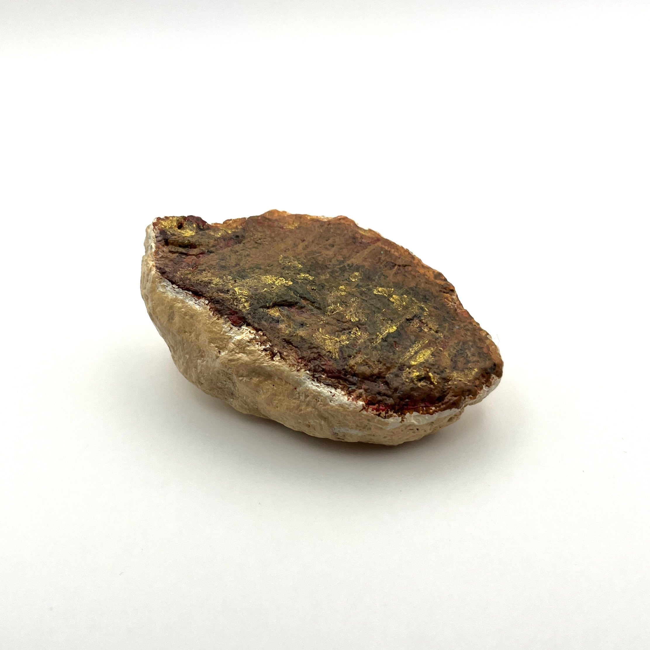 餃子の形をした石は意外とあるんですが、これは本当に餃子でした。焼き面が平らで反対側が餡と折った皮みたいになっています。ただこれは招き石形シリーズなので、顔と小判と招く手を描きました。ちょっと焼きすぎて焦げた餃子になってます。